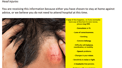 The below is an information card designed for patients to receive should ambulance crews need to non-convey. This information is based on the NICE guidelines – https://www.nice.org.uk/guidance/ng232 (2023). This card has not yet been peer reviewed – please add your feedback on the content and presentation below. If you are not a medic, please add your feedback on presentation below.